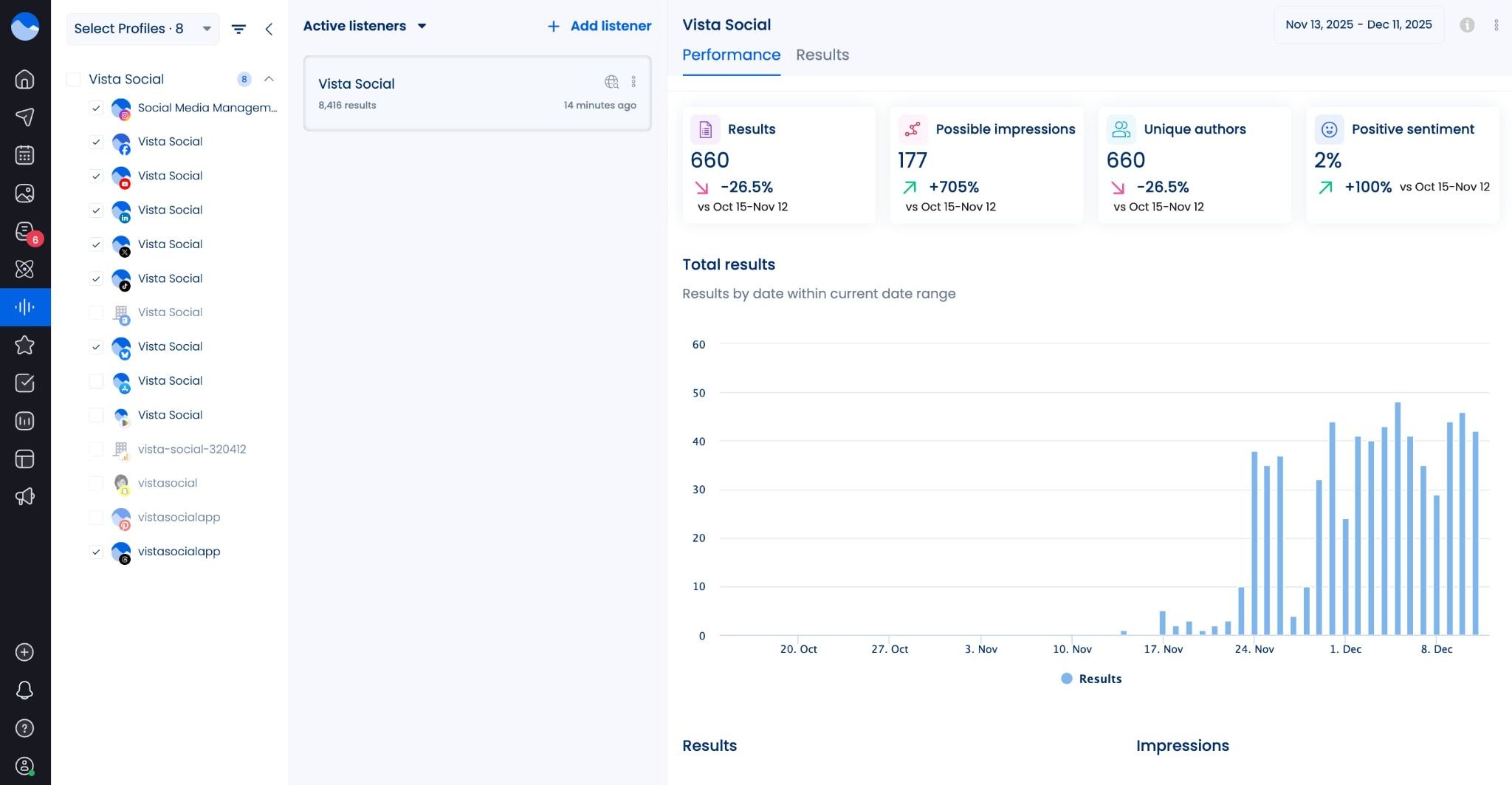 Social listening for Threads: Threads (by Meta) is now available as a source inside our social listening feature. Monitor all brand mentions, trends, and industry conversations happening on Threads, right inside your Vista Social dashboard.