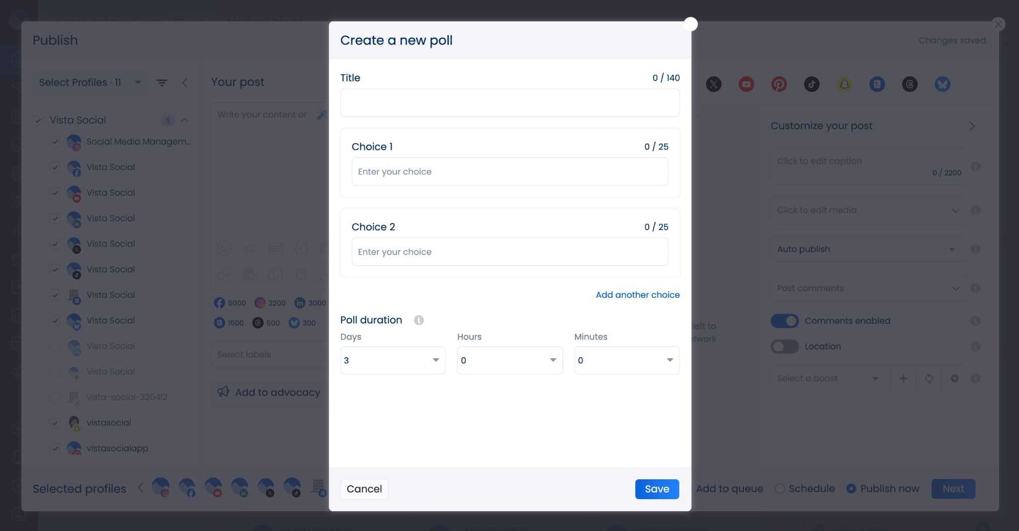 Poll scheduling: You can now schedule polls for all platforms—even ones that don’t natively support them—right inside Vista Social. Select the poll option in the scheduler and add in your options.