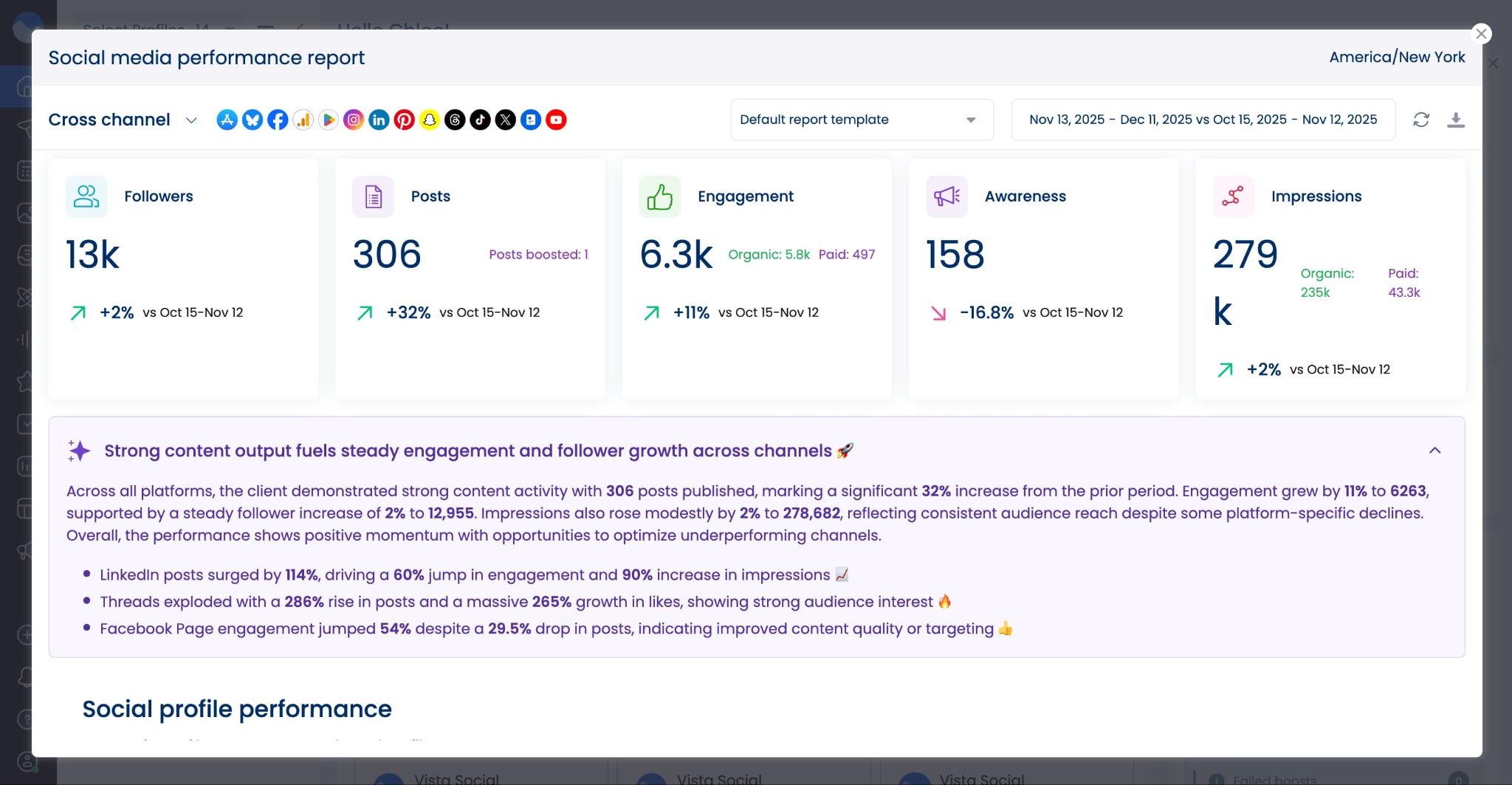 AI report summaries: Cross-platform Social Media and Post Performance Reports now offer AI report summaries, giving you quick insights and recommendations into what’s working and what you should try next.