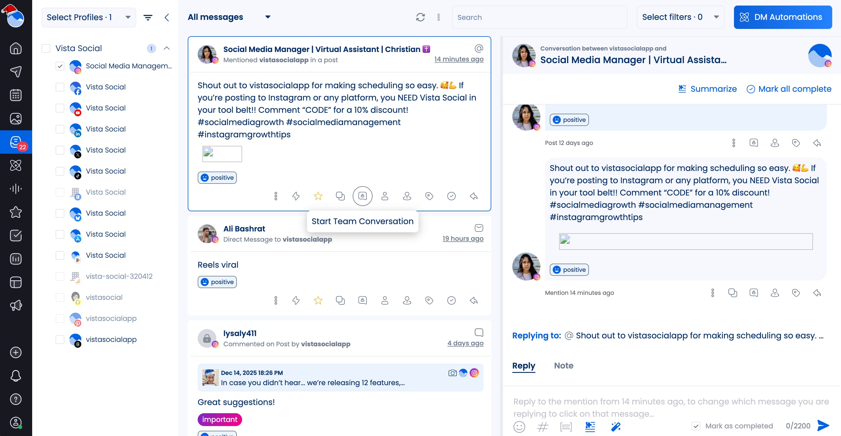 Team conversations in the social inbox: Create internal conversations around comments or messages so you know who’s handling what, you can get approval on responses, and you can stay on top of every customer conversation.