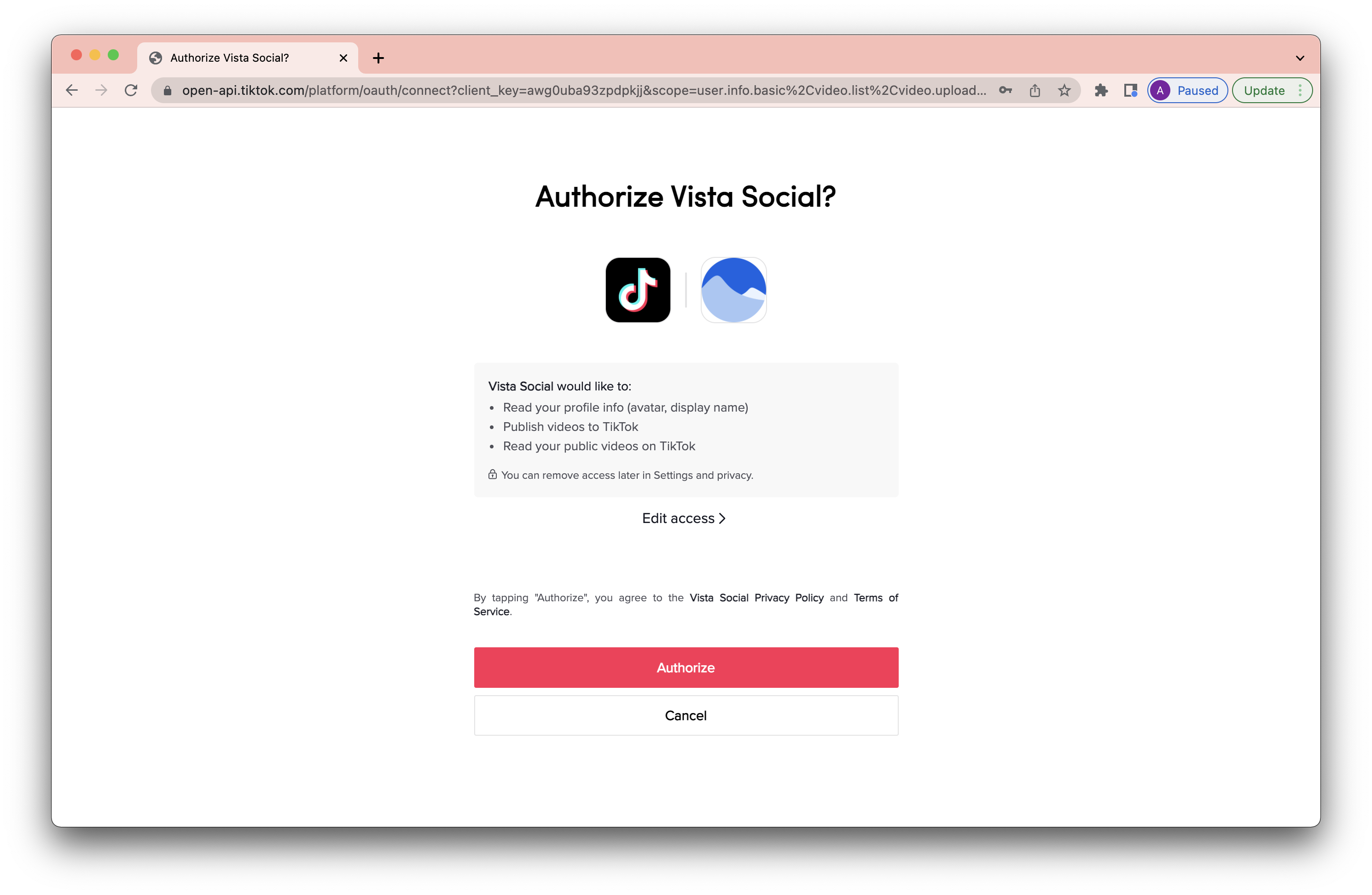 4. Log in to your TikTok profile and click Authorize to authenticate Vista Social.