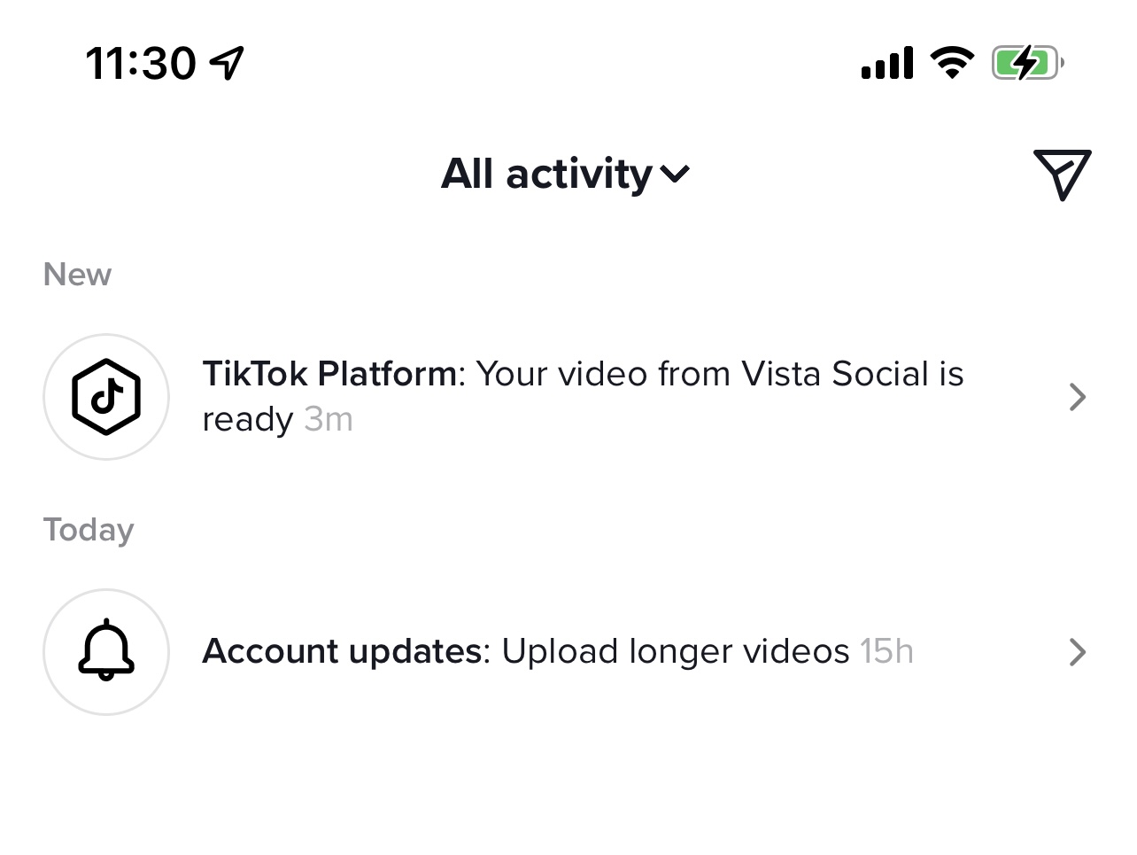1. On your TikTok mobile app, go to Notifications, and you will find a notification that says Your video from Vista Social is ready.