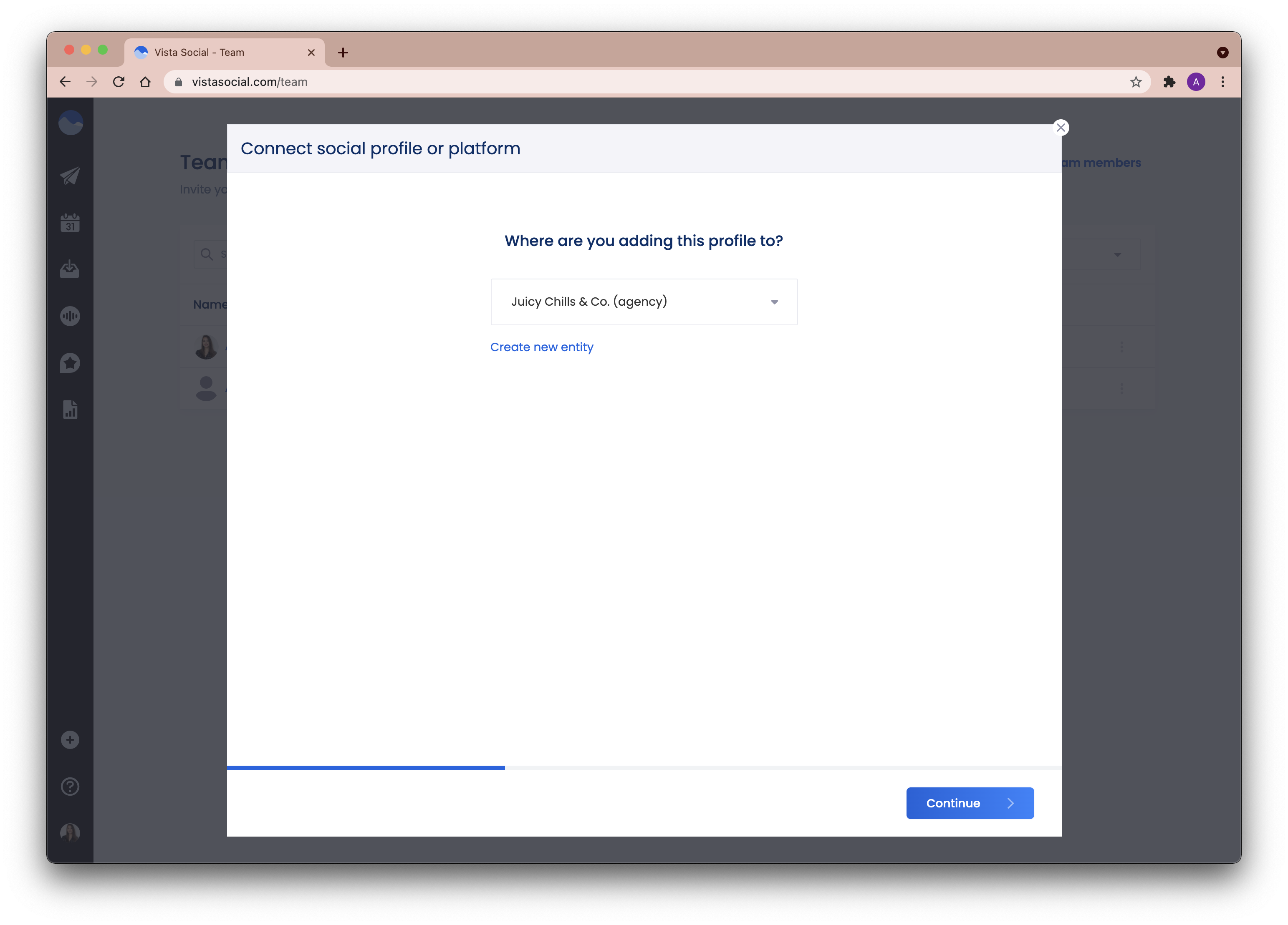2. Choose a brand/entity to add the profile to. You may create a new one if the entity is not on the list yet. Click Continue.