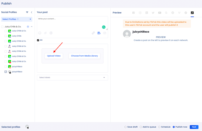 3. Write your content and click the video icon to upload the video you want to push to the selected TikTok profile.