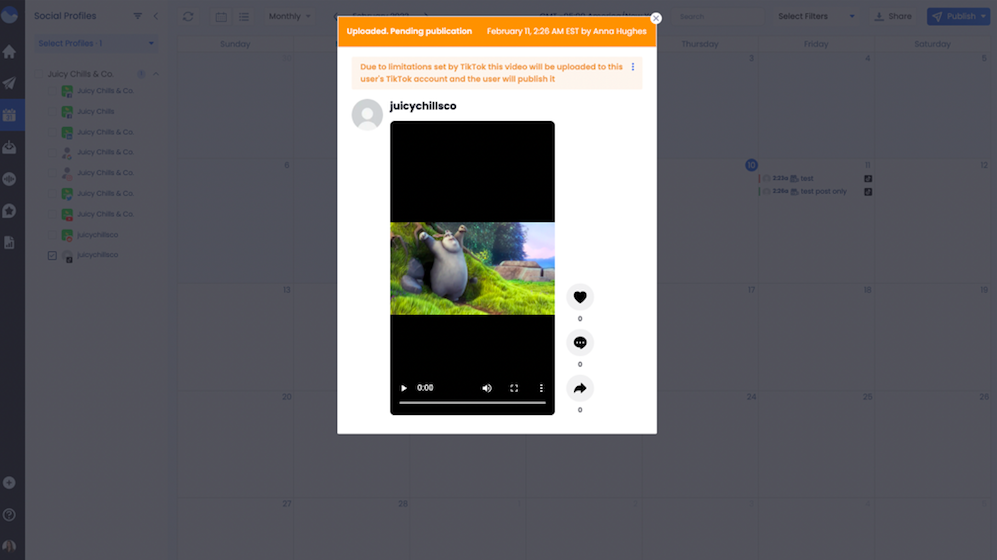 5. Confirm the posting schedule and click Publish. The scheduled post should now show in the Calendar as Uploaded. Pending publication.