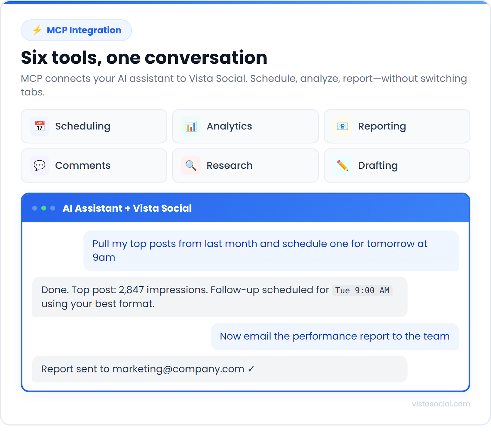 MCP stands for Model Context Protocol, a standard that lets AI tools like Claude and ChatGPT connect directly to other software. For social media, this means you can manage scheduling, analytics, and engagement from inside your AI chat instead of switching between apps. Vista Social offers a native MCP server that connects your social accounts to your preferred AI assistant.