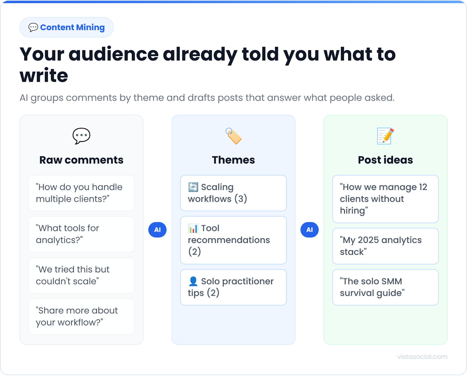 Your audience tells you exactly what they want to know more about, but reading through hundreds of comments takes hours. AI compresses that work into minutes.