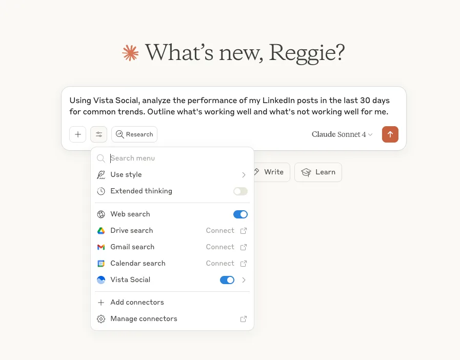 Connect Vista Social to your Claude account through the MCP integration. Then you can ask questions like: “Analyze my last 30 days of social media performance across all platforms. What content types performed best? What should I do differently next month?”