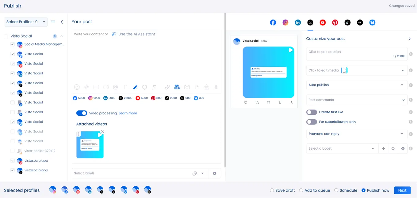 When paired with Vista Social’s approval workflows, your team can review and publish videos confidently, knowing each one meets your brand standards before it goes live.