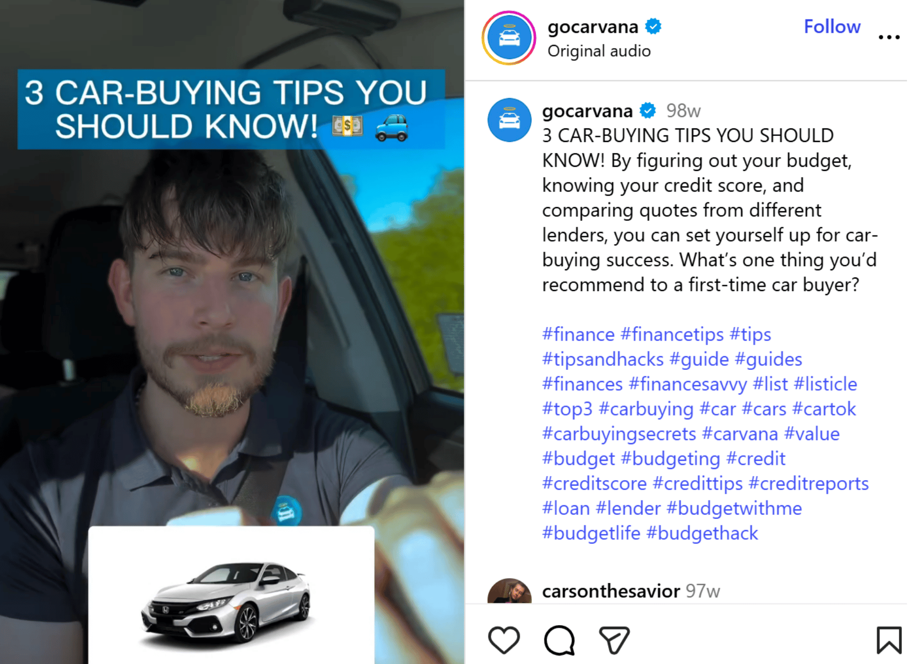 For example, you can create an Instagram Reel similar to Carvana’s video on easy financing or test-drive checklists, then share more tips on what to look for during a test drive or how to negotiate a better deal.