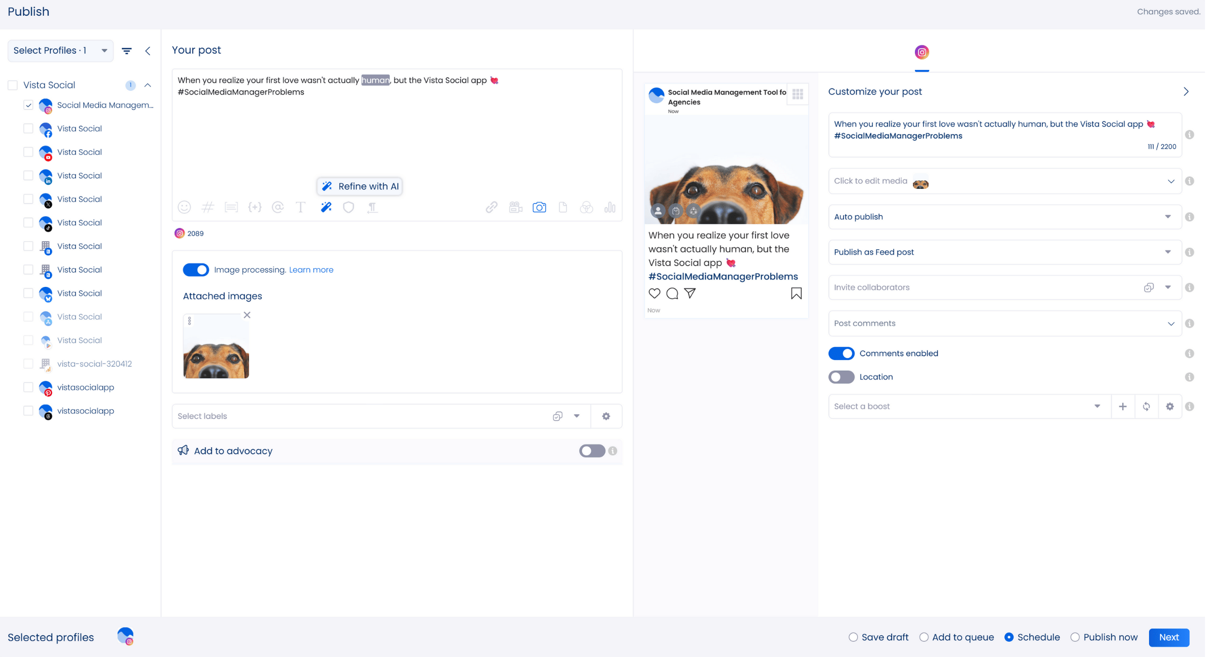 The platform’s features simplify and speed up everything from managing profiles to publishing posts and tracking analytics. Vista Social’s social media publishing feature lets you build posts for your clients and set them to go out automatically.