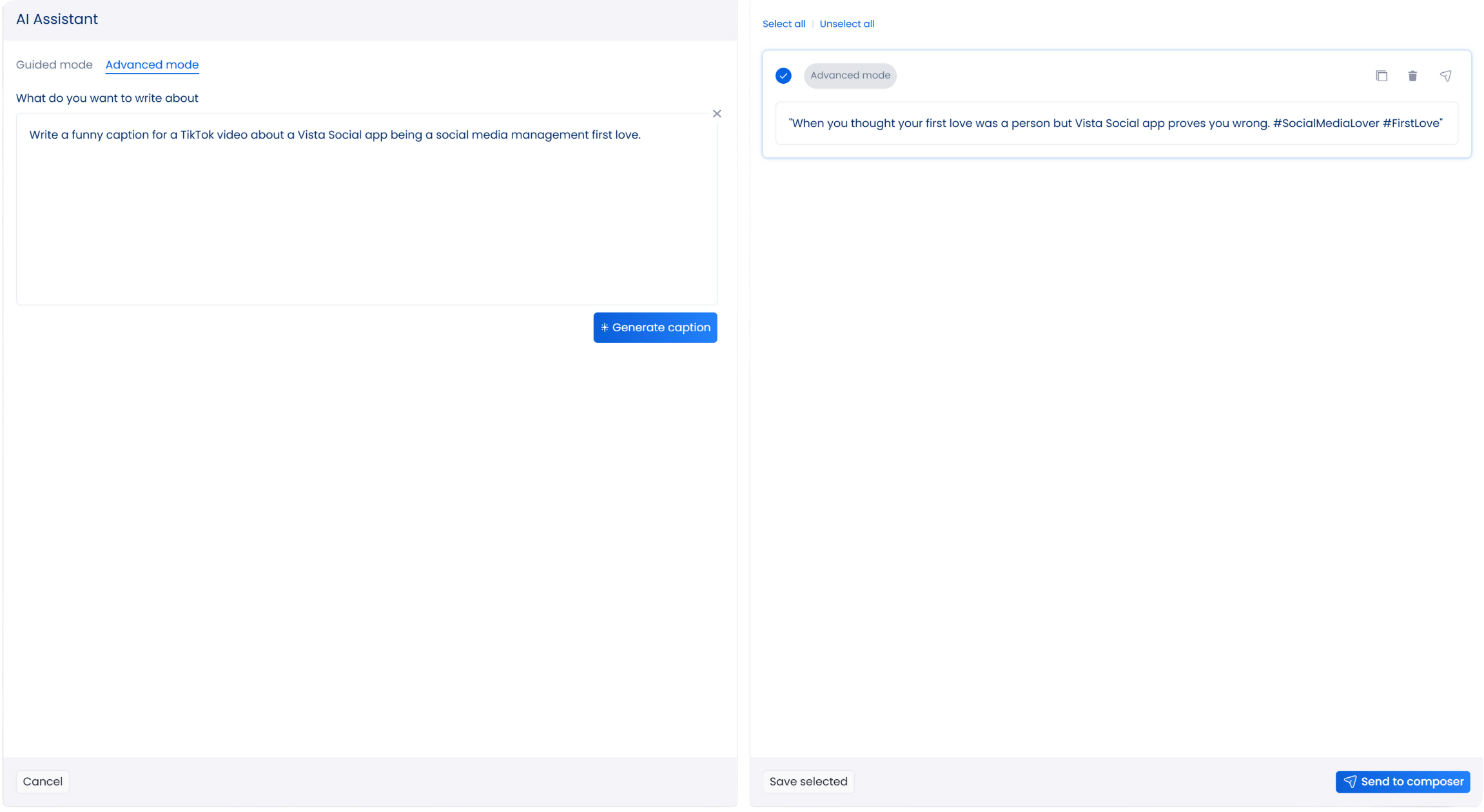 The AI Assistant helps you create captions and taglines in seconds, improving them automatically based on your client’s tone and voice.