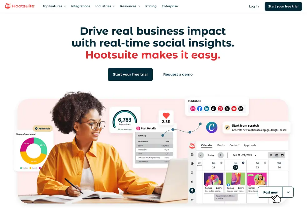 Hootsuite begins at $149 per month, so it’s already positioned for teams that need more structure in their workflow. The upper tier reaches $399 per month and gives you added room for users and platform coverage. Enterprise groups can also request custom pricing when they need something built around heavier operations.