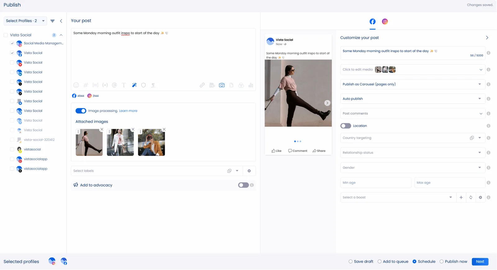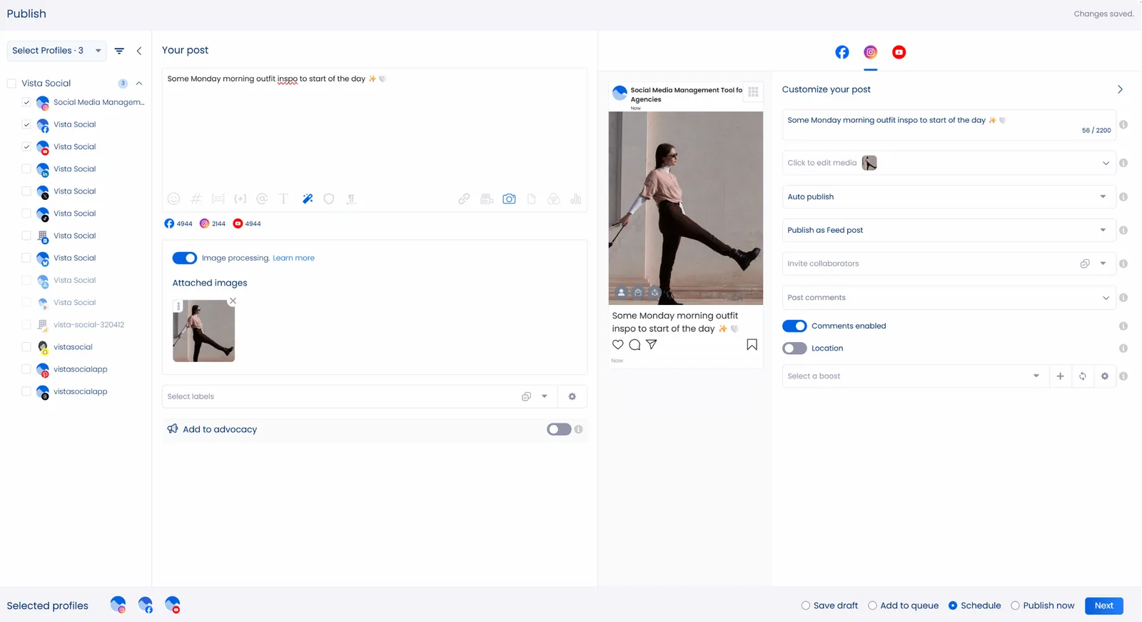 You can start creating and scheduling content as soon as you set up your account and connect your clients’ profiles across their social channels.