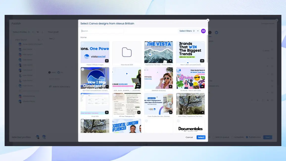 Vista Social now integrates directly with your Canva account, giving you instant access to all your designs, including videos, without ever leaving the platform. No downloads. No tab-switching. Just pure creative flow.
