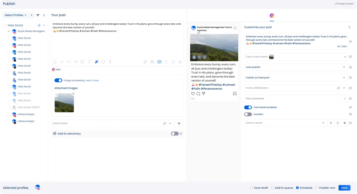 Creating social media posts is only half the work. You must spread the content to the ends of the earth for your clients to reach and connect with their followers and boost engagement. Streamline your content publishing with social media management tools for churches like Vista Social.
