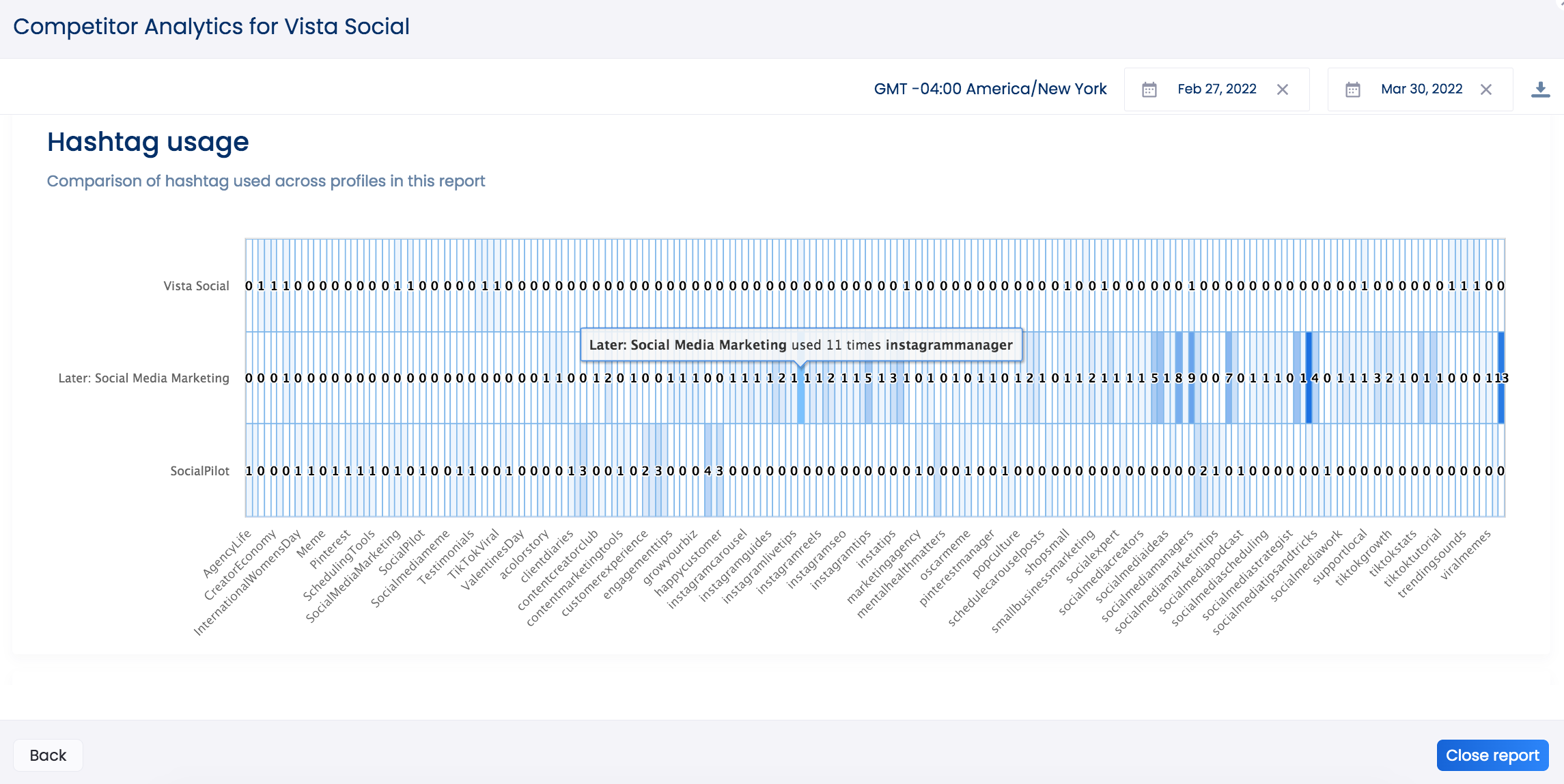 With Vista Social’s new free competitor monitoring report, you can gain more accurate benchmarking and discover key insights into your competitors’ social media strategies. Learn about how your posts perform compared to others and discover which hashtags, time of day, and type of content get the most engagement from your target audience.