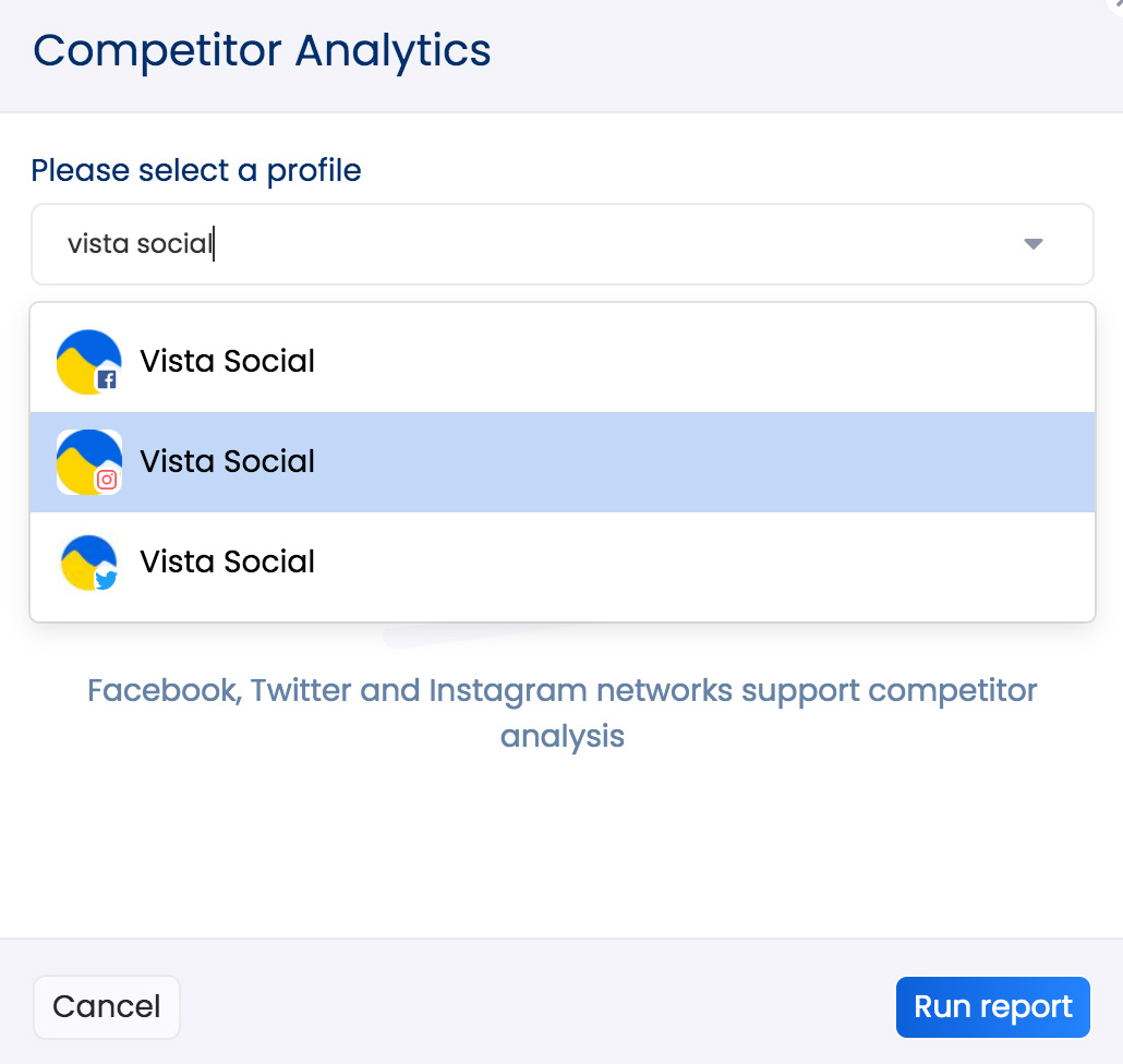 Choose your profile from the drop-down that you would like to compare against your competitors. Next, you will need to add up to 4 competitor profiles. Type in your competitors’ social media handles into the search bar. Once you’ve added your competitors, click on Run Report.