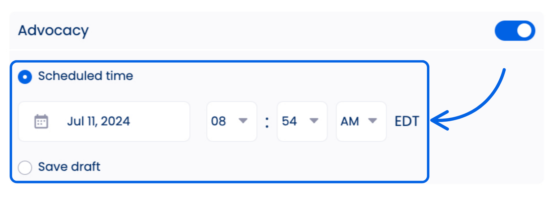 You can schedule a time to make your advocacy posts available to your advocates or save them as drafts.