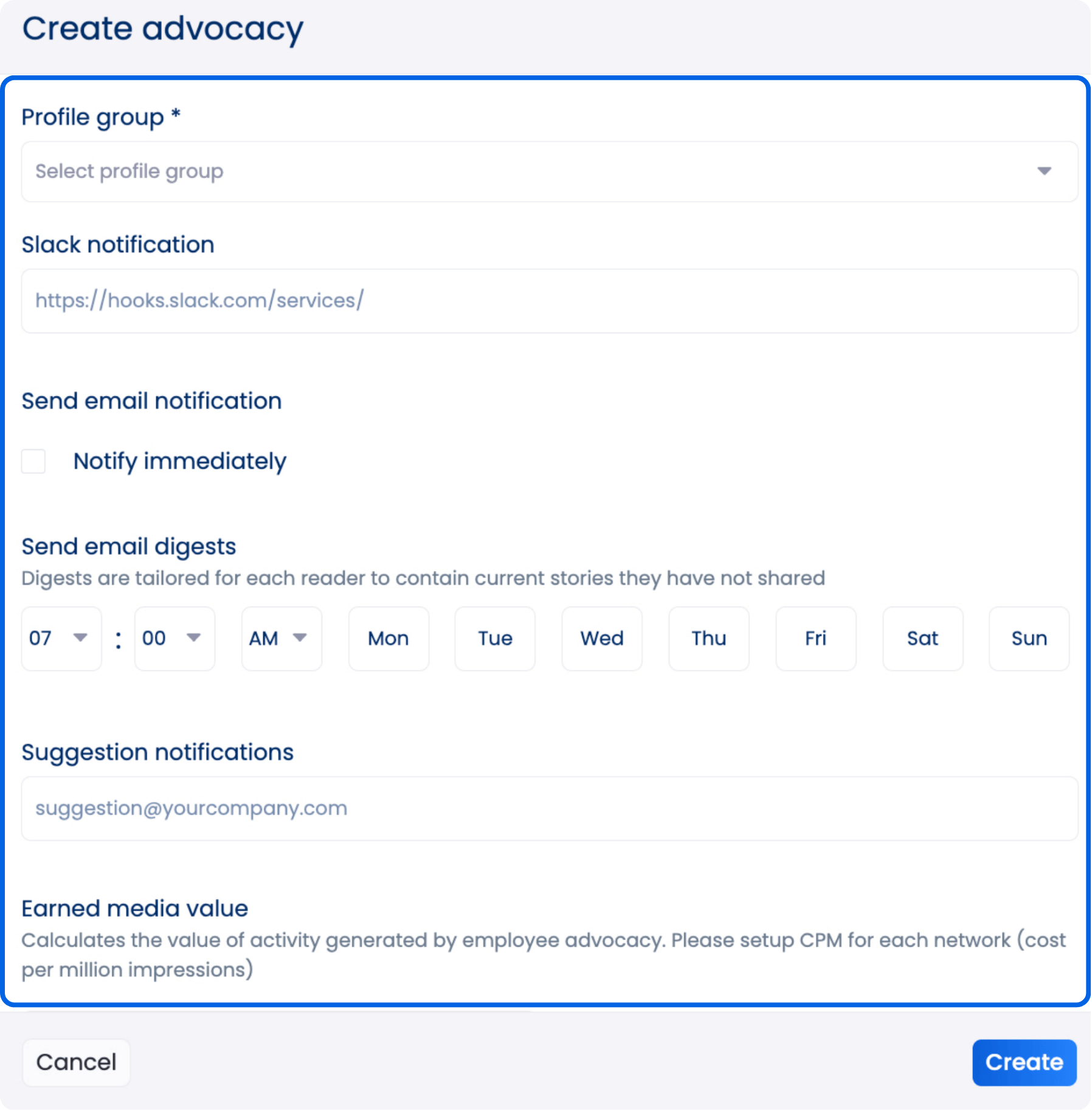 You can set up Slack and email notifications to alert your team and advocates when new posts are up and ready for them to share.