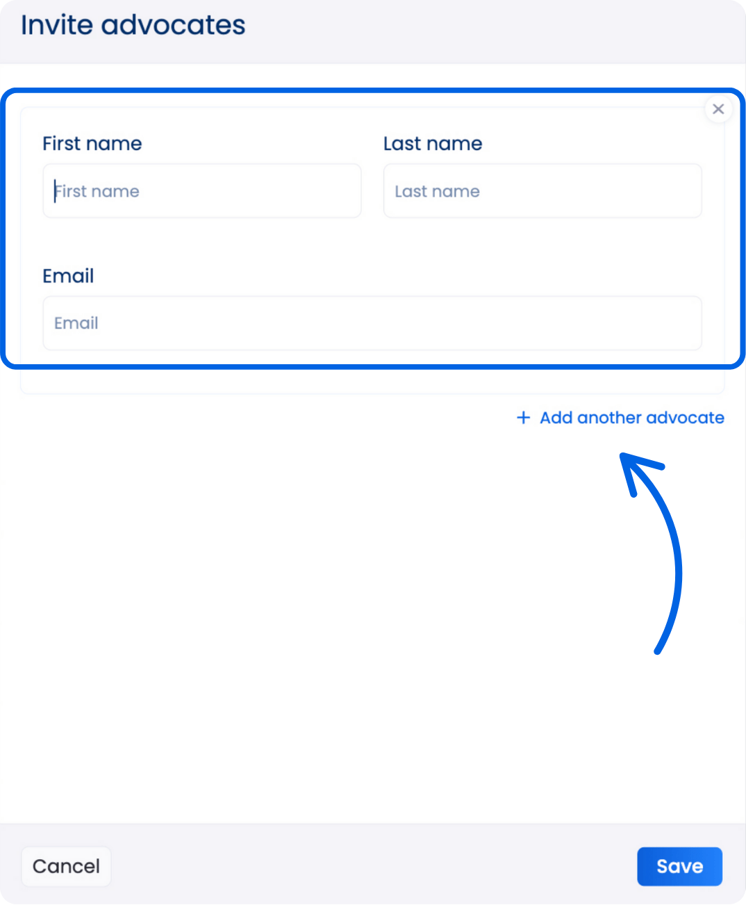 Next, invite your advocates by uploading a CSV file of their names and email addresses. You can also input the information manually.
