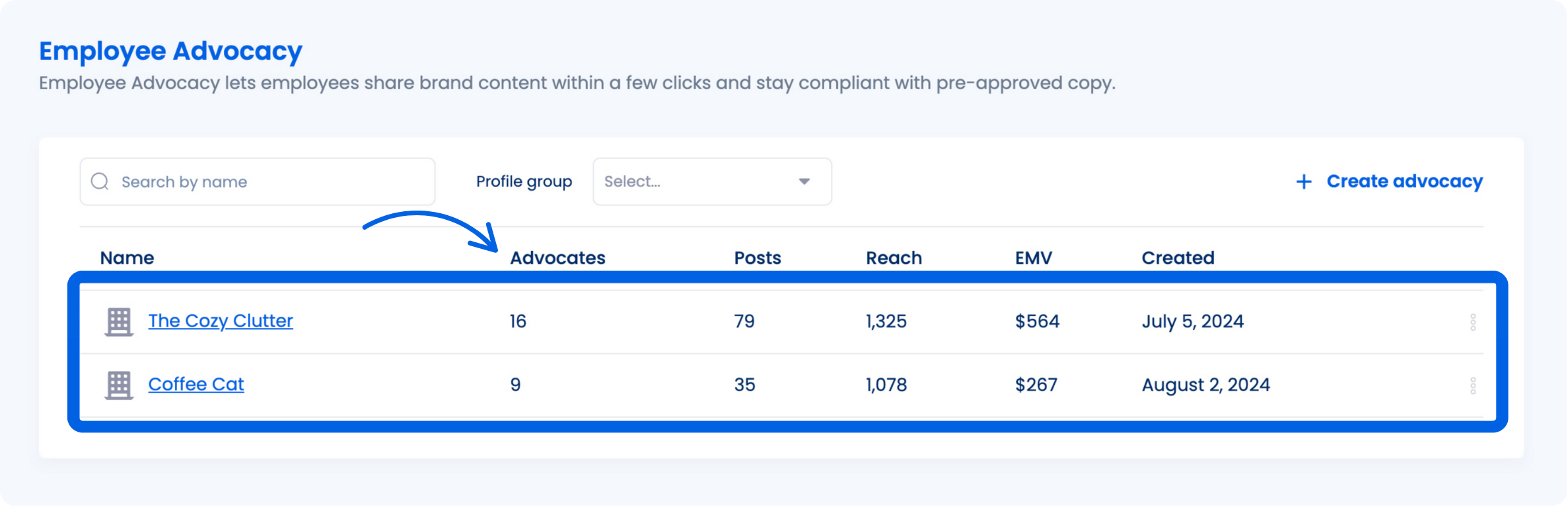 You’ll see details and tools for your advocacy program on the platform’s Advocacy dashboard.
