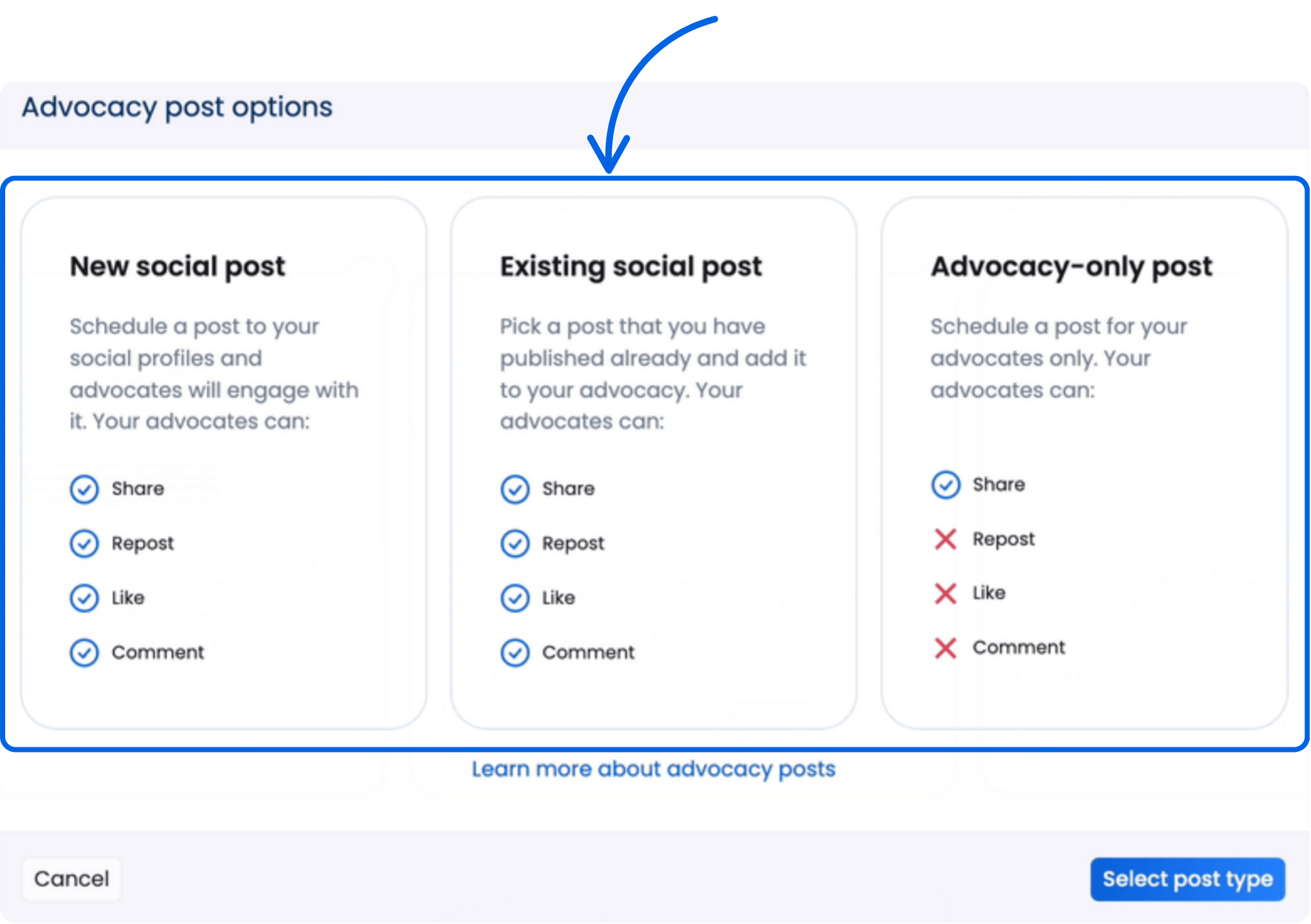 Plus, the platform goes beyond letting your advocates share your brand’s content, allowing them to like, share, comment, and repost your advocacy posts.