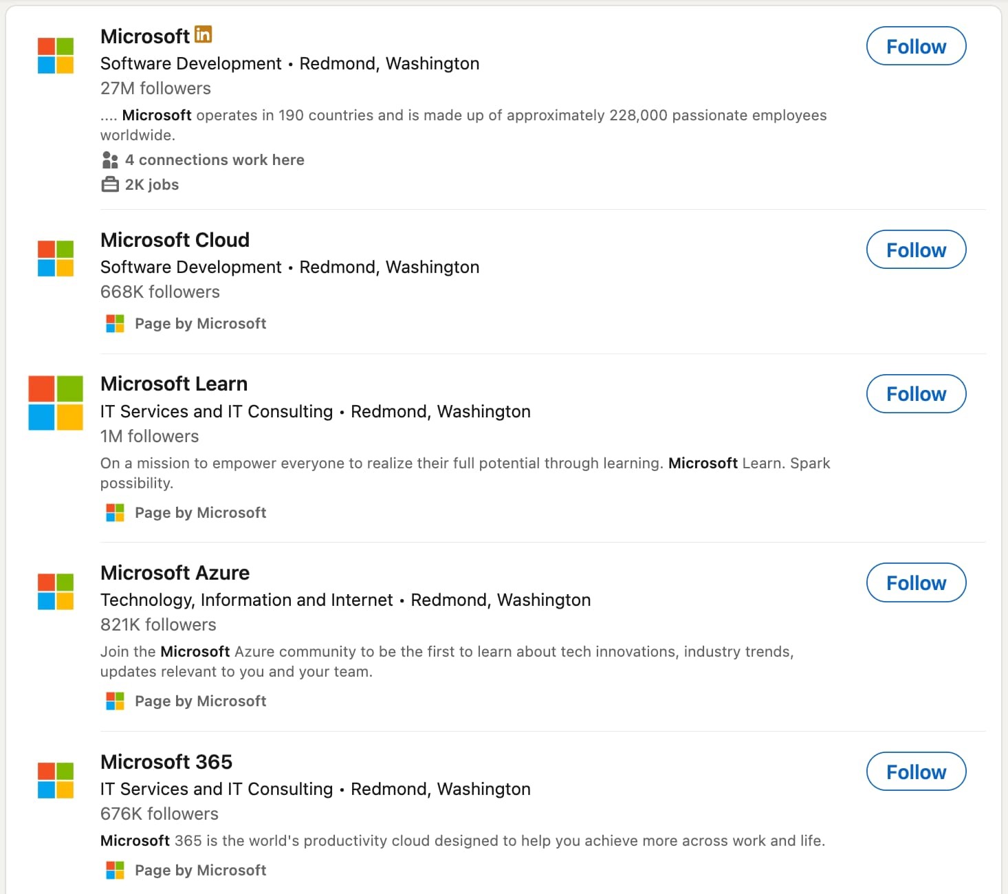 Microsoft provides a great example of this. A quick LinkedIn search shows us that the brand has at least two dozen subpages for their different products.