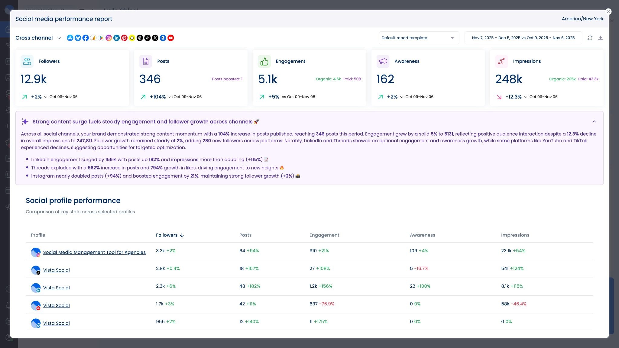 Vista Social’s analytics dashboard provides comprehensive reporting across all your social accounts with customizable views for different team roles.