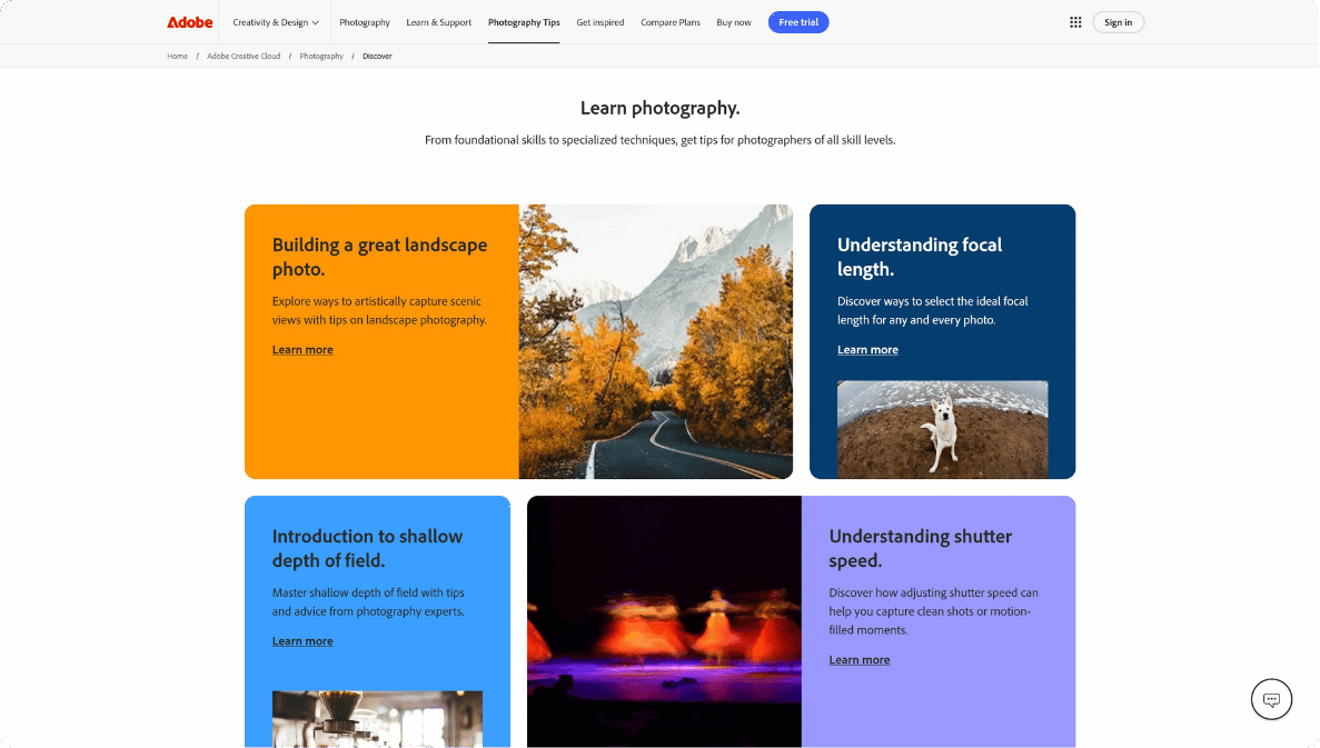 Adobe’s photography hub teaches photography skills that work with any camera. They focus on core concepts like lighting, composition, and camera settings.