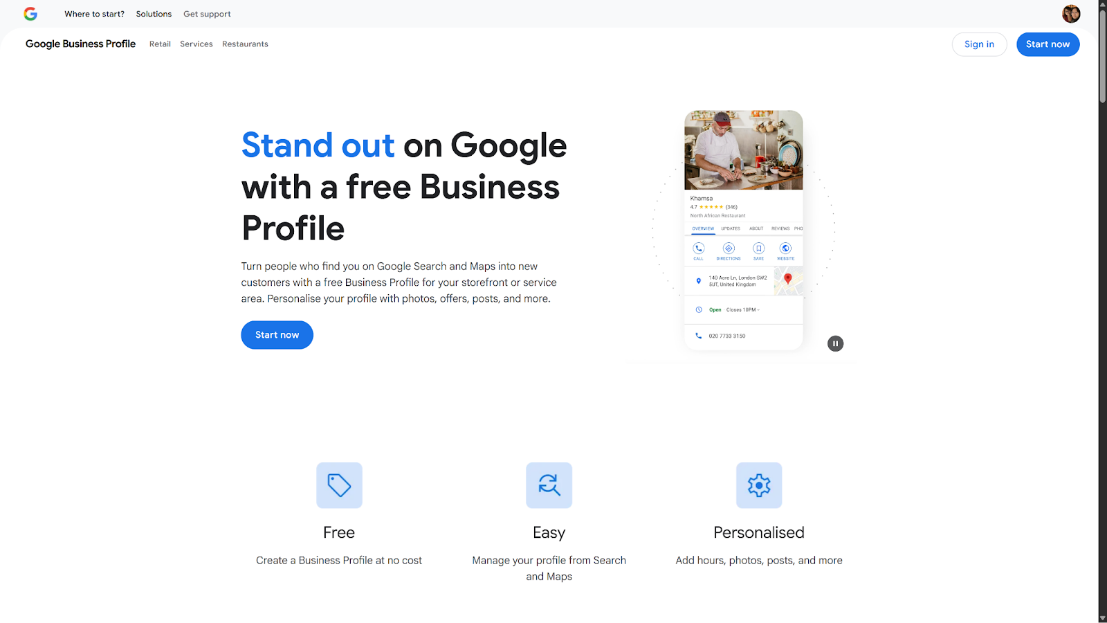 Visit the Google Business Profile website and click either the “Sign In” or the “Start Now” button. You’ll need to sign in with a Google account, and use your business email if you have one.