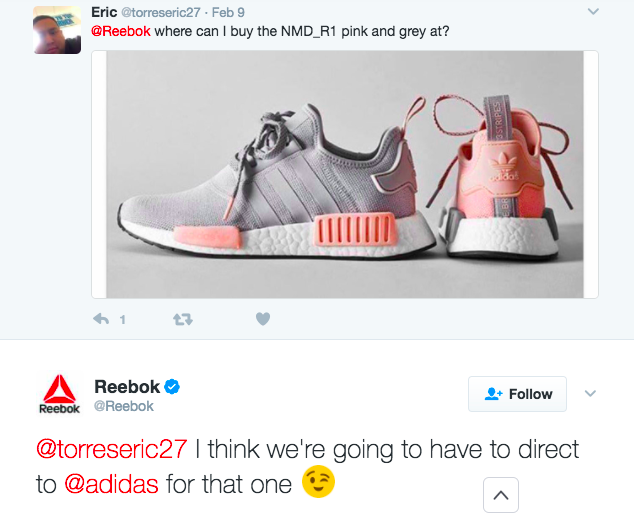 Just take a look at one funny example, where Eric did not notice the brand’s name of the trainers and asked Reebok about them. Reebok answered the question and directed the guy to the competitor.