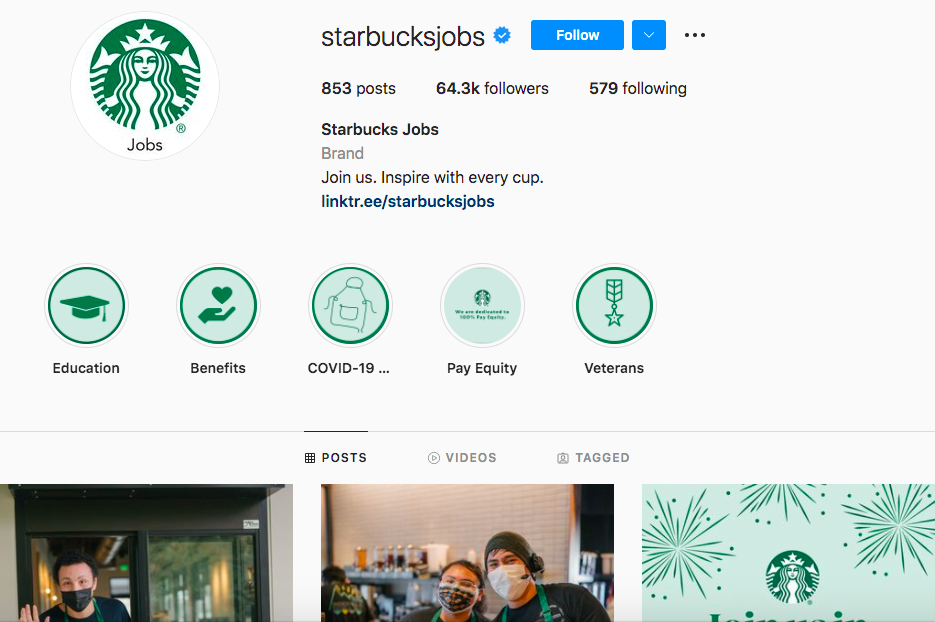 One of the reasons to manage multiple accounts on Instagram is separating your career & jobs offerings and marketing efforts. One of the bright examples is the Starbucks Jobs profile, where the company talks about working in their stores and offices, Starbucks internships, College Achievement Plans, and more. The brand leverages multiple profiles to reach the right audience and meet its goals. You will undoubtedly agree that marketing and employment accounts will have different types of content created for the specific audience.