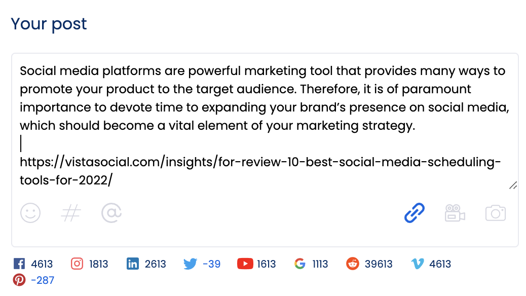 A character counter can be a big help when creating your posts. Vista Social has one built into its publishing tool. It shows the maximum character count in the box below were you add your text (bottom left)when you are creating your post:
