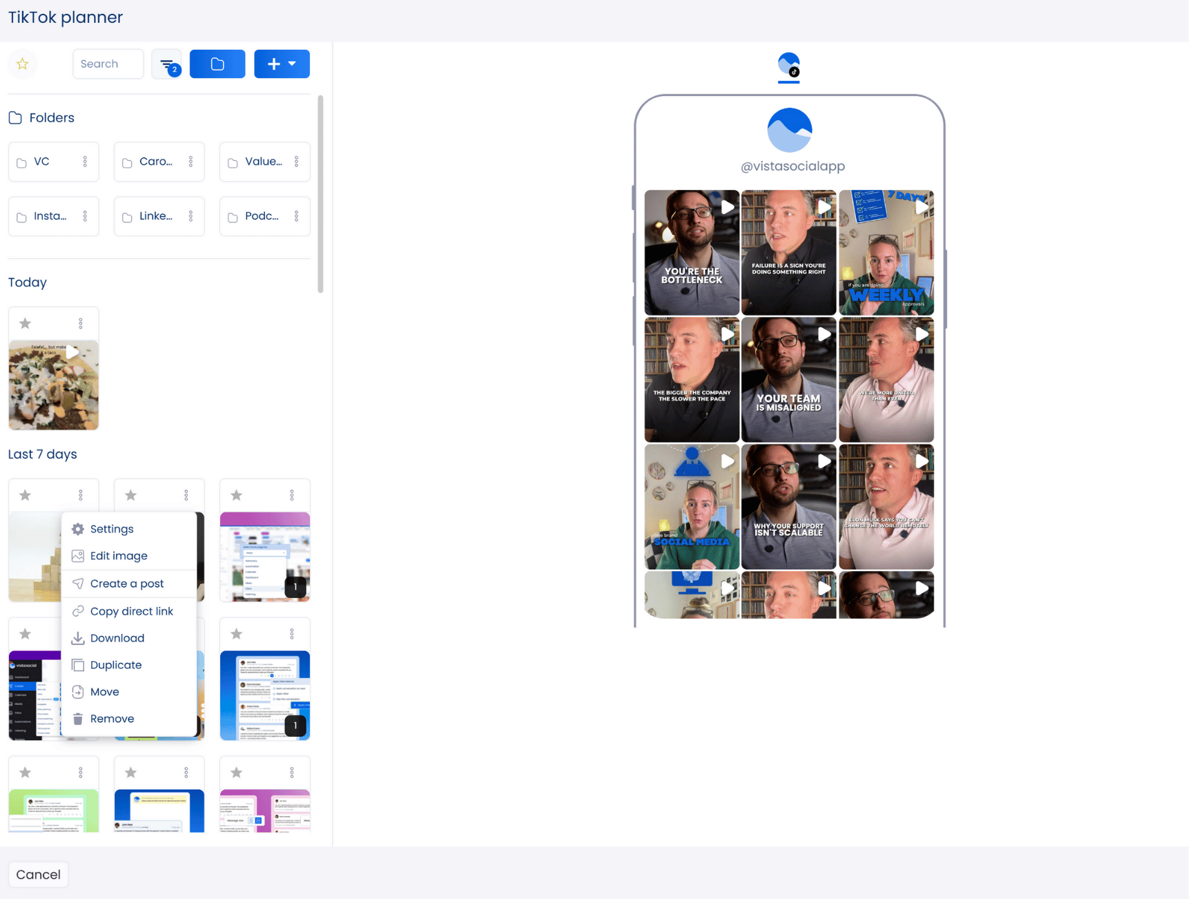 Vista Social gives you the core publishing tools you need, along with advanced features that make high-volume posting far more manageable. Use the Vista Social Visual TikTok Planner to organize your scheduled videos for auto-publishing using a drag-and-drop tool.