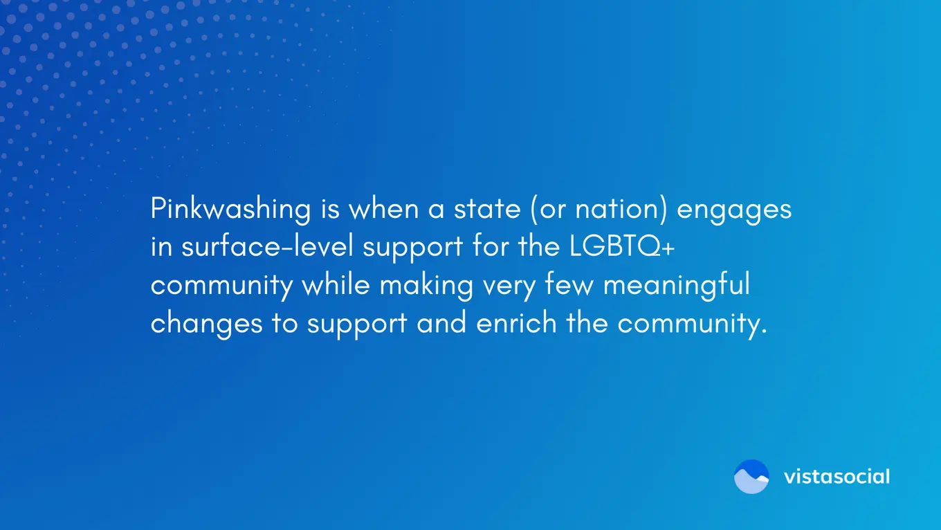 More specifically, pinkwashing is when a state (or nation) engages in surface-level support for the LGBTQ+ community while making very few meaningful changes to support and enrich the community.