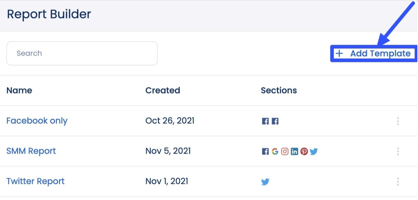 Click the +Add template option at the top-right of the Report Builder popup window.