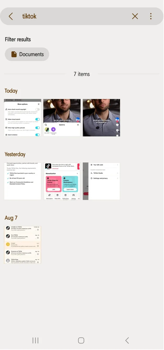 Use your device’s photo gallery app to check if TikTok videos were saved, since automatic saving still depends on the device you’re using and the settings enabled at the time you posted. The easiest way to do this is to use the search tool and enter the keyword “TikTok.”