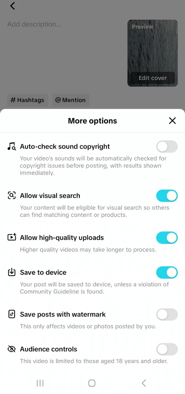 That’s it. The video is now saved to your device’s camera roll. Double-check to see if TikTok videos are automatically saved to your device from the post editor. When creating a TikTok post you may see a Save to device option under More options but this toggle is not always available.