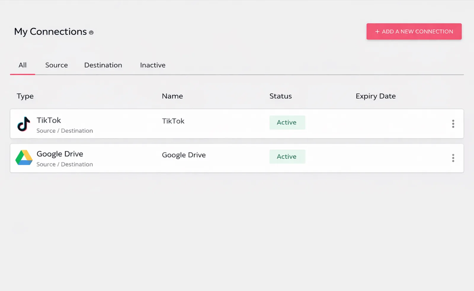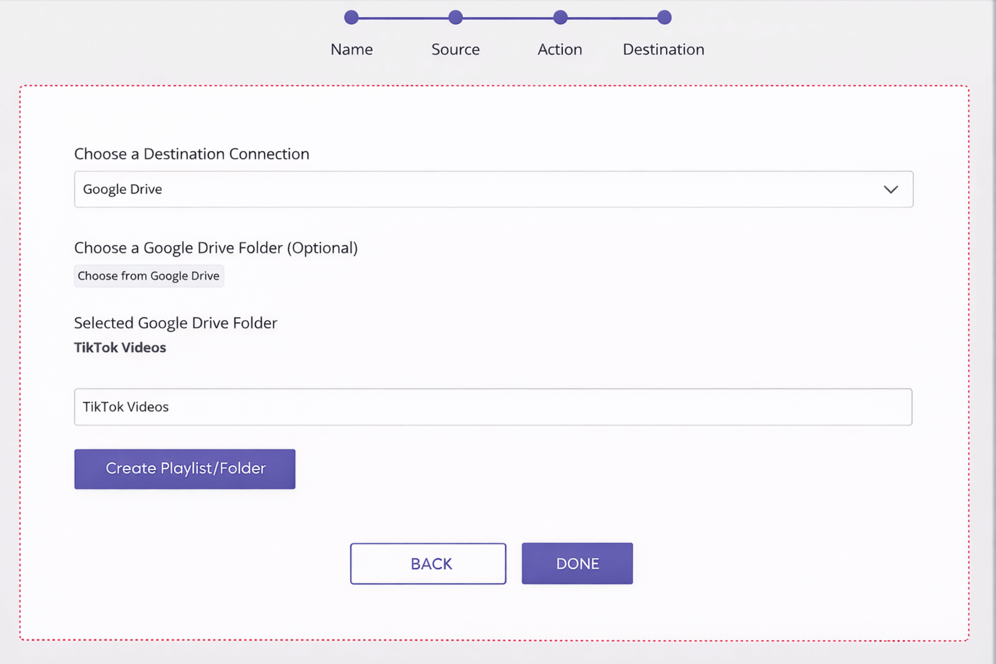 Next, create an automation or workflow that uses TikTok as the source and Google Drive as the destination, following Repurpose.io’s current setup flow. Create a workflow with TikTok as your source and Google Drive as the destination. Be sure to select ‘Upload Video’ as your workflow action and create a new folder to make your videos more searchable on Google Drive.
