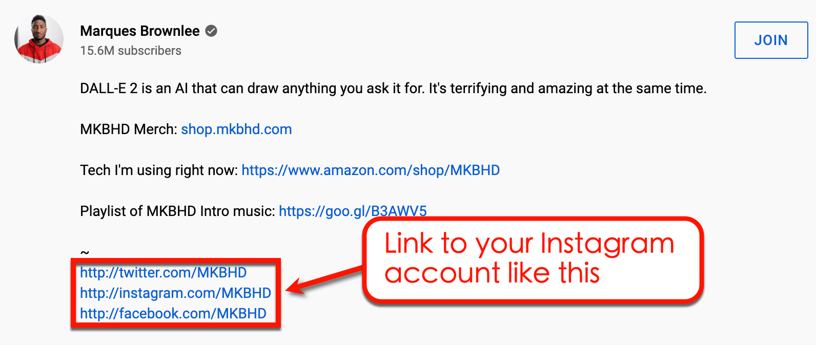 Big-name influencers like Marques Brownlee constantly include a link to their social media accounts, including Instagram, in their content descriptions.