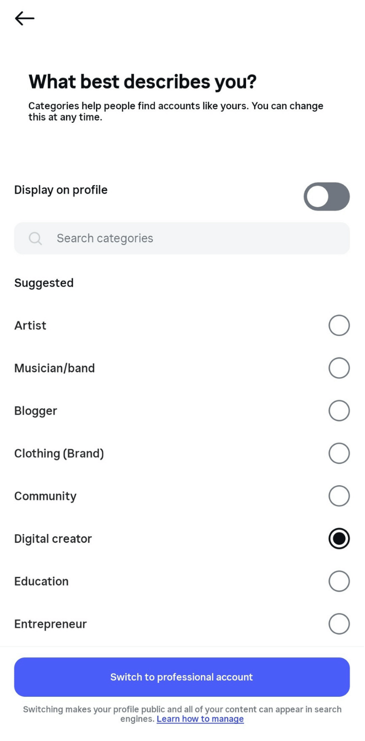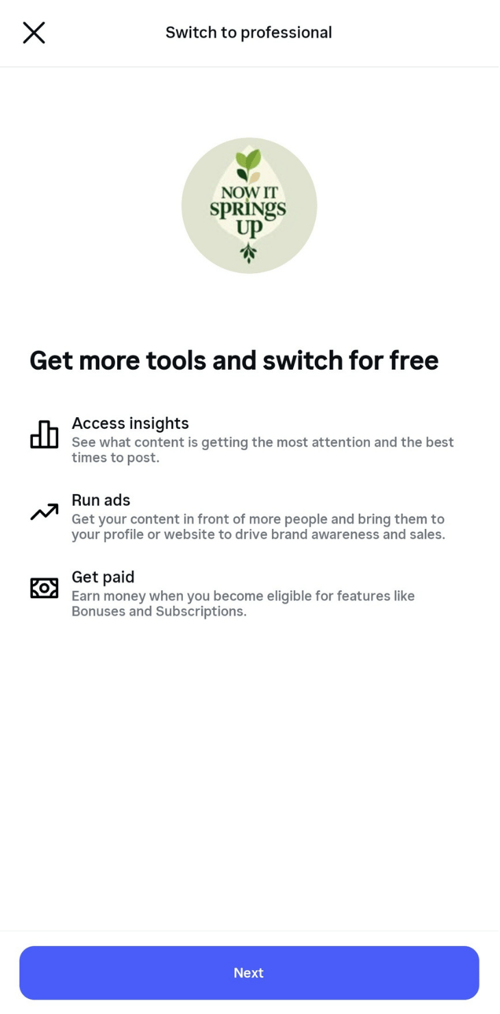 Go to your client’s profile and tap the menu icon in the upper right. Go to Settings and privacy and look for the section that lets you switch to a professional setup.
