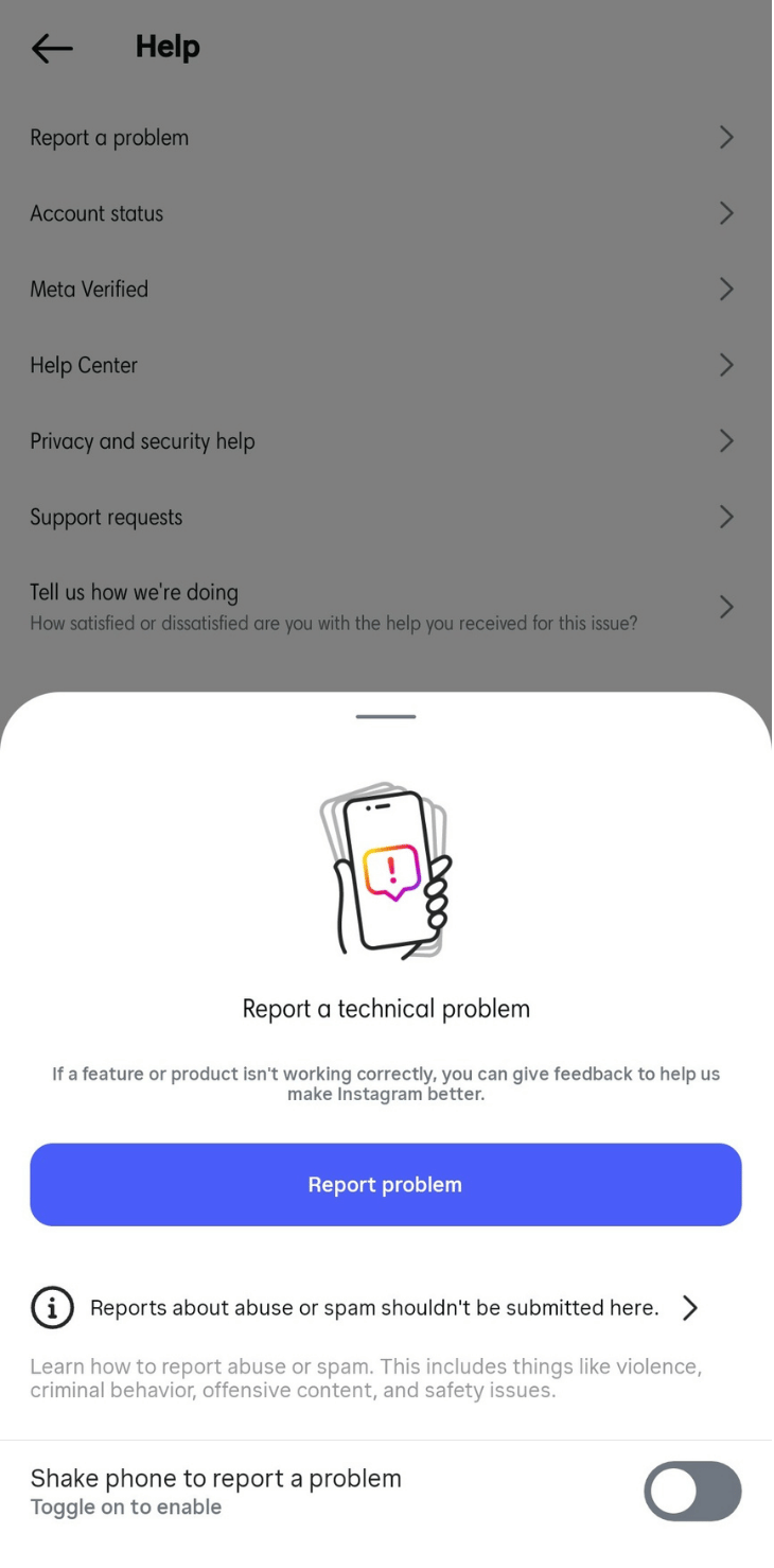Instagram may ask you to send a screenshot or screen recording of the issue, depending on the device you use. You can turn off that option and tap Report a problem to submit the issue the usual way.