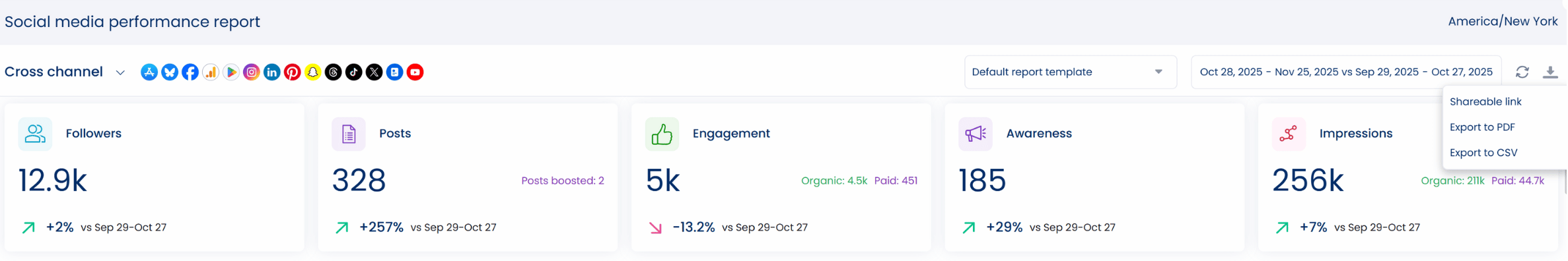 Share reports through links or export reports to CSV or PDF files to share with clients or team members.