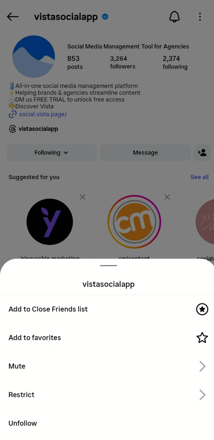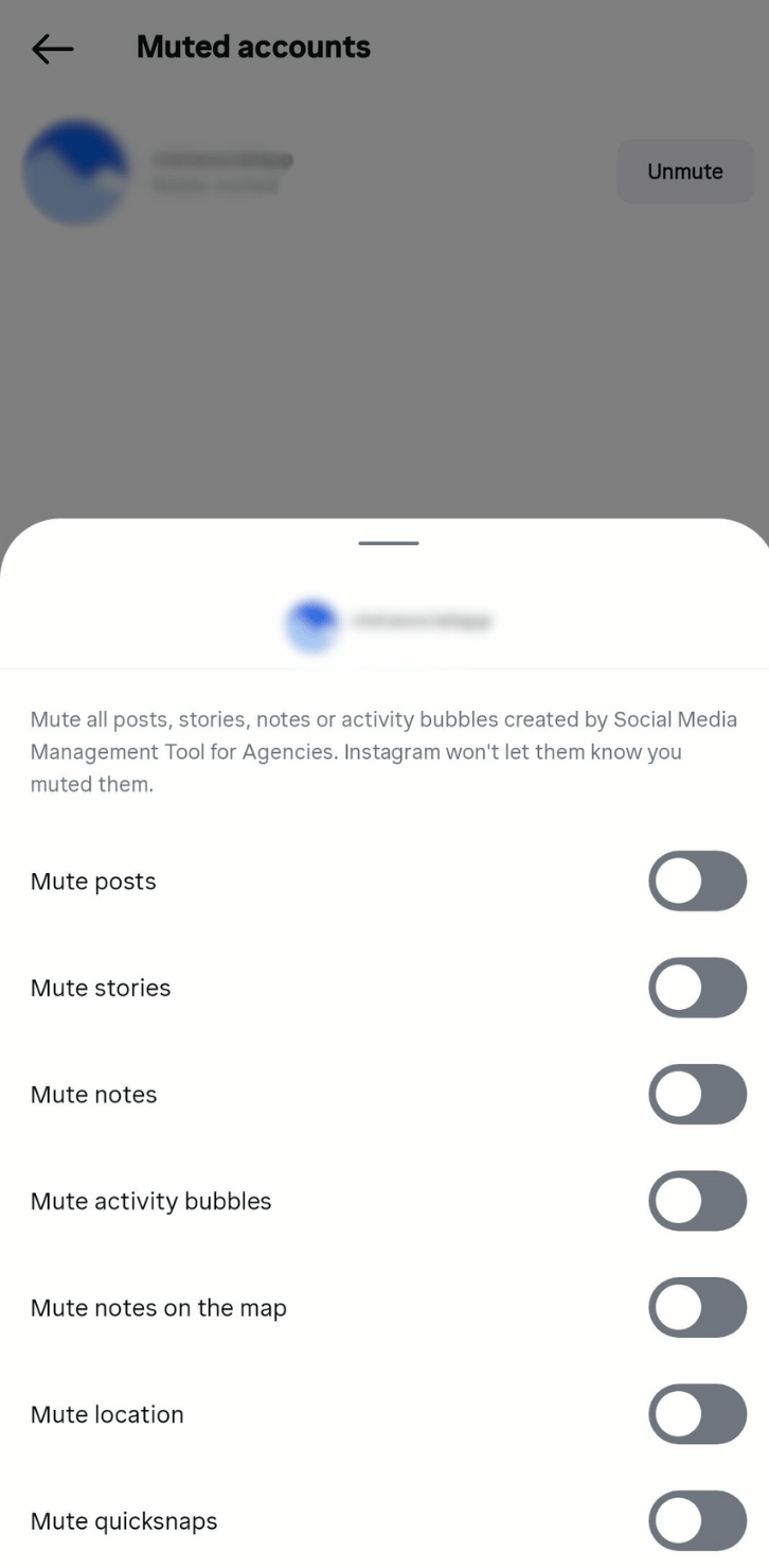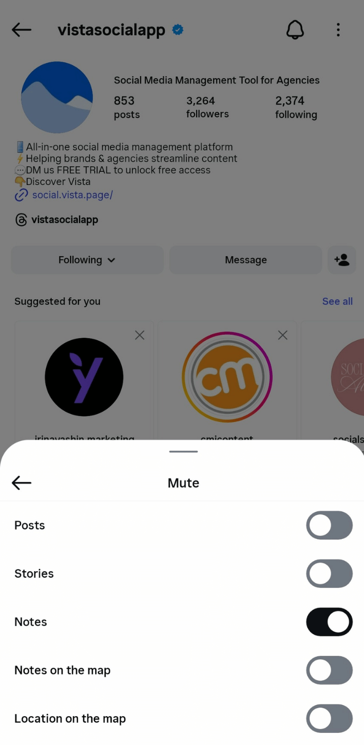 You can mute Instagram Notes from other users, like muting posts and Stories for your clients. Navigate to the user profile your client wants to mute. Tap the Following button on their profile and choose Mute. Toggle the Notes switch to mute it, and you’re done.