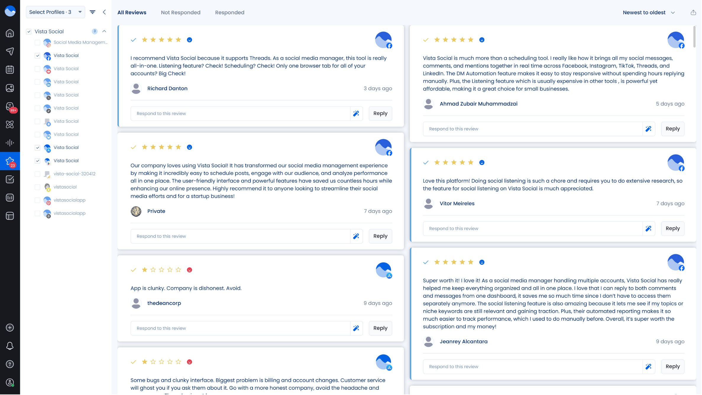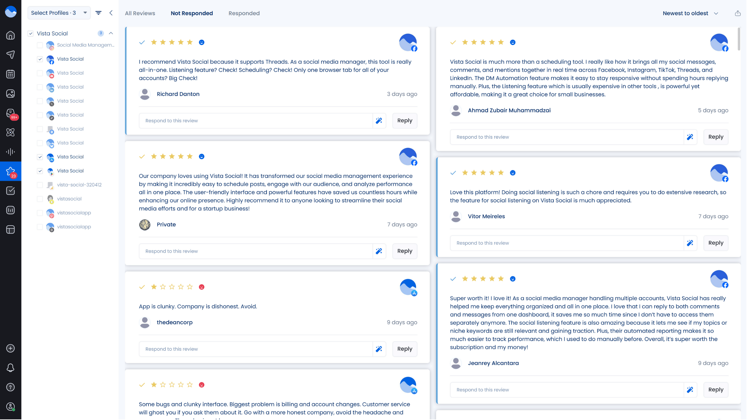Vista Social’s engagement tools make this easy. The platform’s unified Social Inbox lets you manage every message, comment, review, and mention in one view. You can handle all of your clients’ interactions without switching between accounts.