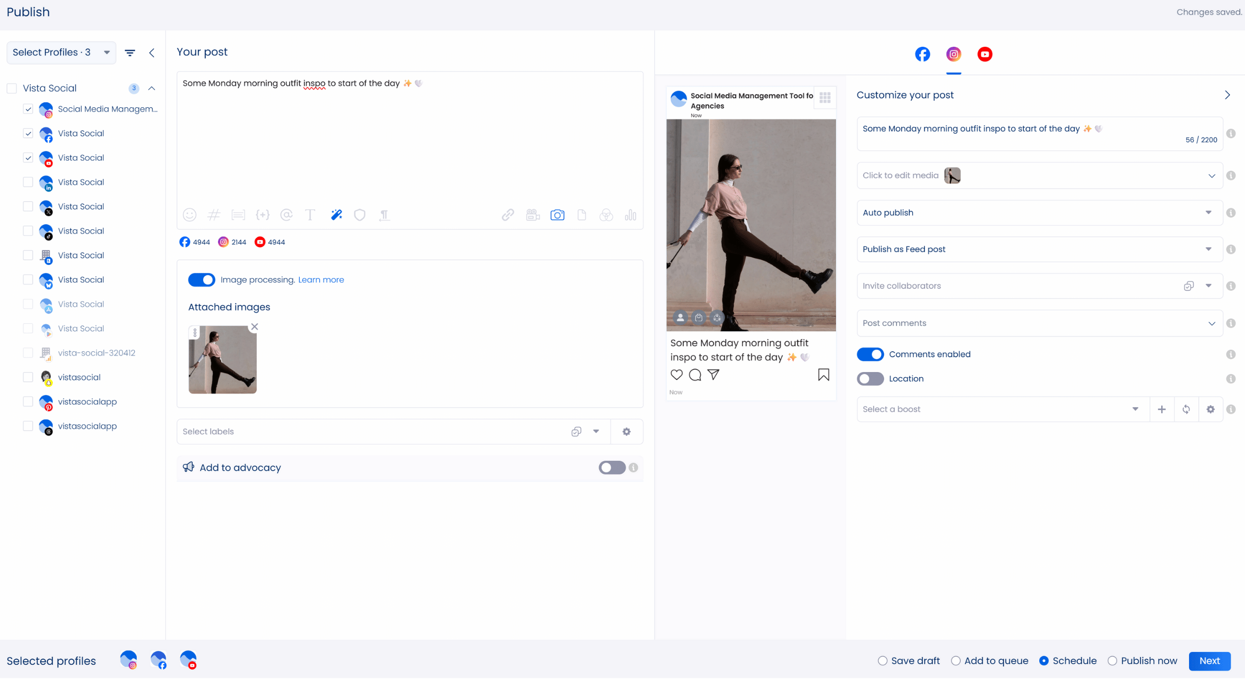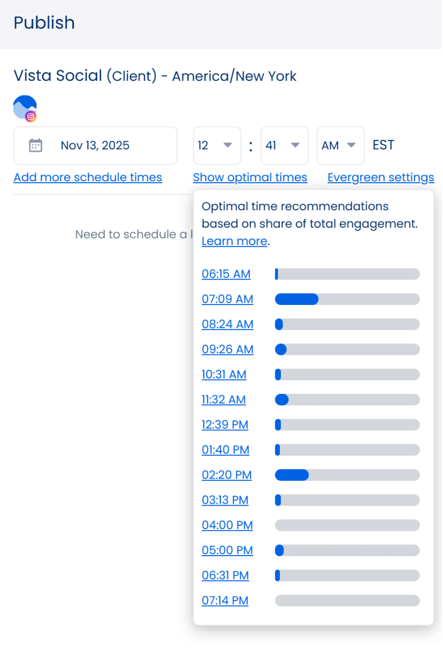 Once your posts are ready, schedule them to auto-publish at the exact times you choose. Vista Social even recommends when to post based on engagement patterns. You can also queue or bulk-schedule posts to keep campaigns running without constant oversight. When you’re handling multiple clients, this level of automation makes your day-to-day much easier.