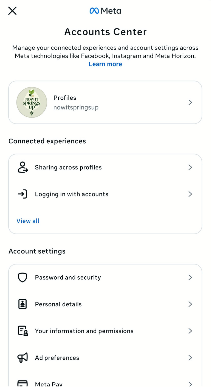 Open the Instagram app and log into your client’s account. Then tap the Profile icon at the bottom right. Tap the menu icon at the top right, then select ‘Accounts Center’.