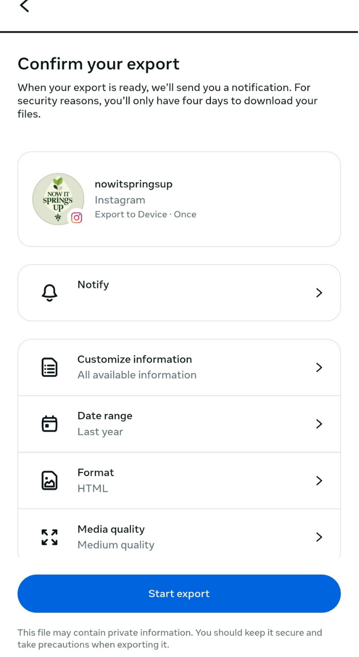 Once the file is ready, Instagram sends the download link to the email connected to the account. The link arrives fairly fast, although bigger exports can take more time.