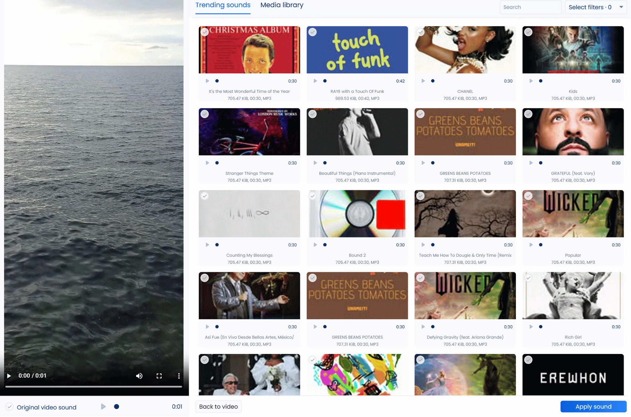 Use the search bar under the ‘Trending sounds’ tab to look for specific songs. Otherwise, select one of the recommendations below and click ‘Apply sound.’ You can also check out trending audio on Instagram to see what sounds are currently pulling the most engagement.
